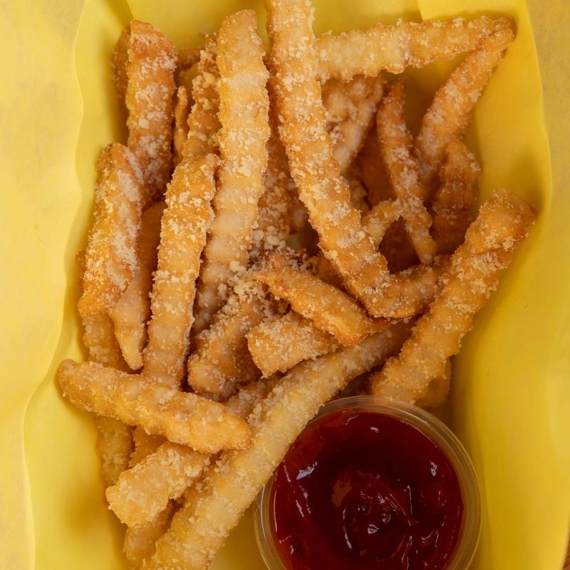 Thin-sliced dill pickles hand-tossed in a light breading and fried to a golden brown.