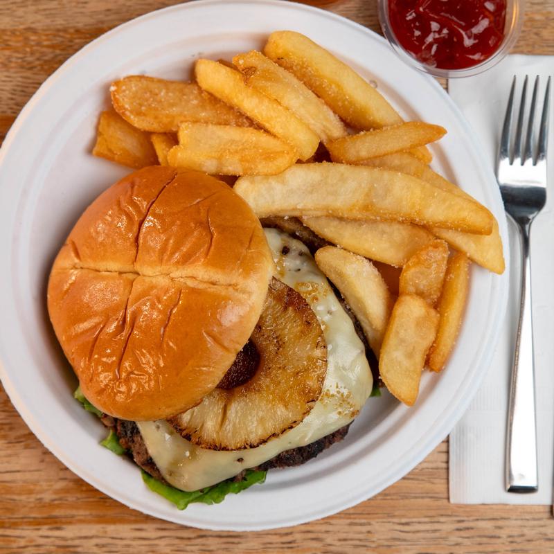 Marinated beef patty, lettuce, tomato, mayo, Swiss cheese, grilled pineapple, teriyaki sauce, brioche bun, side of fries (or try it with our marinated chicken).