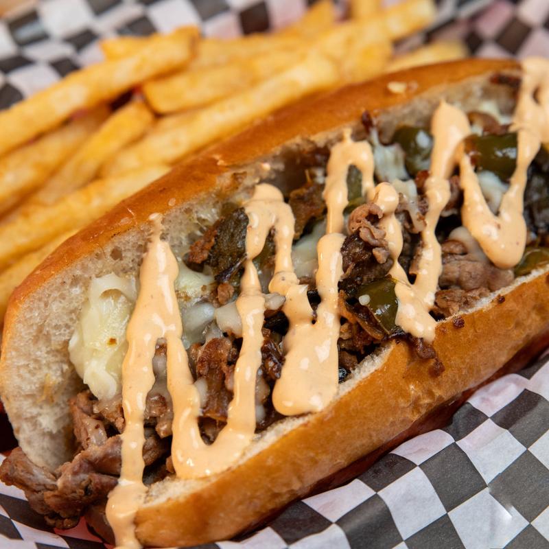 Fresh-cooked steak with caramelized onions, roasted bell peppers, and melted provolone cheese, topped with chipotle aioli.