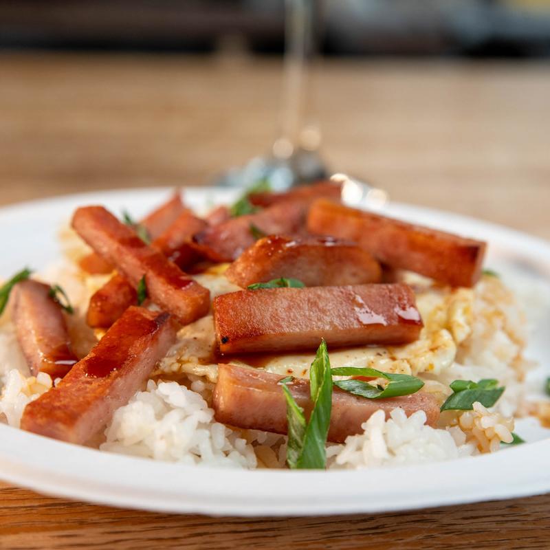Grilled Spam, one egg over easy, steamed rice, sweet teriyaki sauce drizzle.