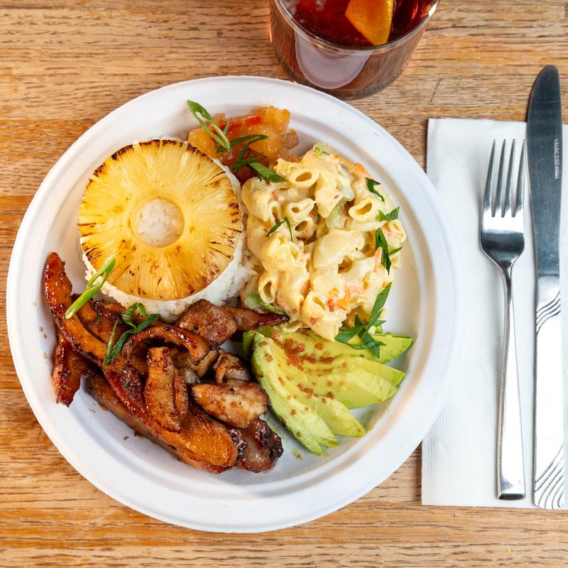 Marinated grilled chicken, steamed rice, Hawaiian mac salad, avocado, grilled pineapple, citrus pineapple mango chutney.
