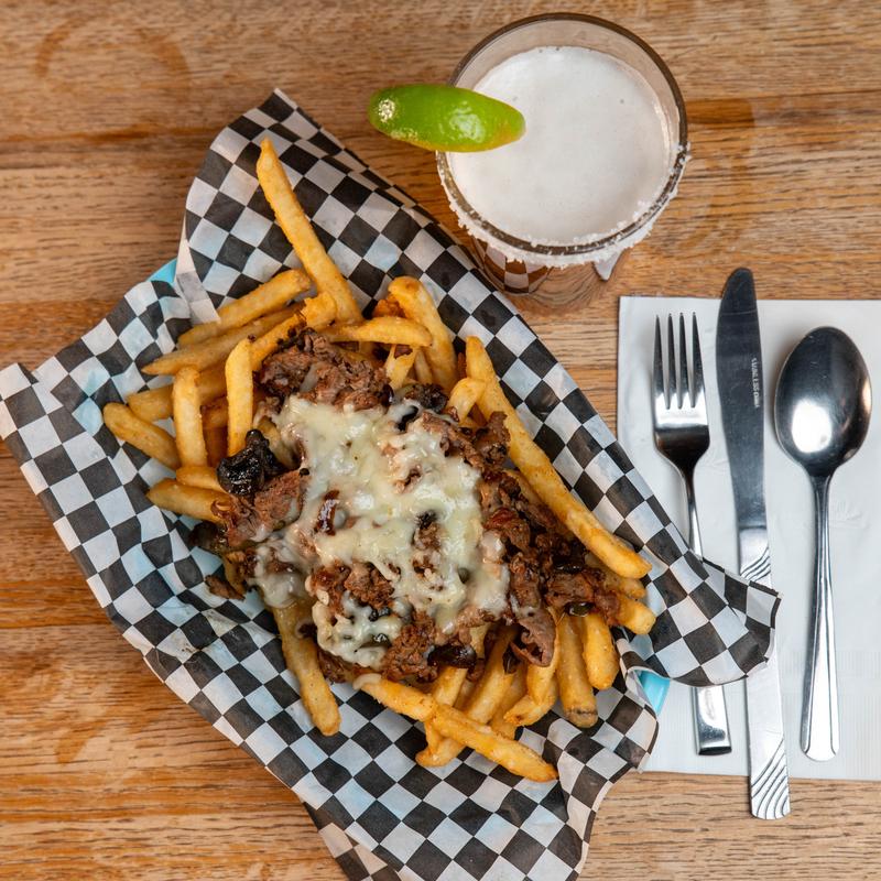 Basket of crispy French fries topped with cheddar 'whiz' sauce, fresh-cooked steak, and caramelized onions.